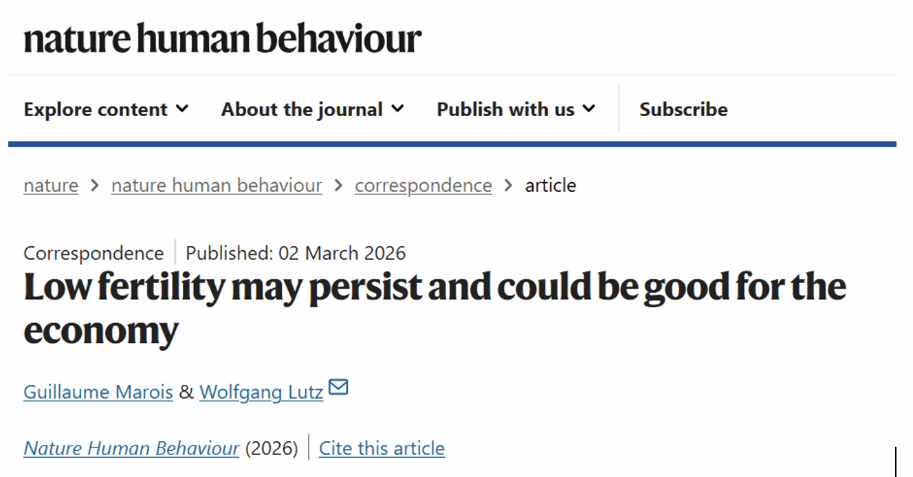 Professor Guillaume Marois and Distinguished Professor Wolfgang Lutz, from the Institute of Demography and the Asian Demographic Research Institute (ADRI) at the Department of Sociology, Shanghai University, published their latest research findings titled “Low fertility may persist and could be good for the economy” in the top-tier international academic journal Nature Human Behaviour on March 2, 2026. Prof. Lutz served as the corresponding author, with Shanghai University listed as the corresponding institution. This marks another significant breakthrough for the Asian Demographic Research Institute in publishing in a top-tier international journal.